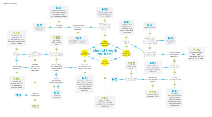 Posted on January 24, 2011April 13, 2014 by jenbokoff Should I work for free? A flowchart by Jessica Hische. Better-than-average funny. Share this: Click to share on X (Opens in new window) X Click to share on Facebook (Opens in new window) Facebook Like Loading... Related