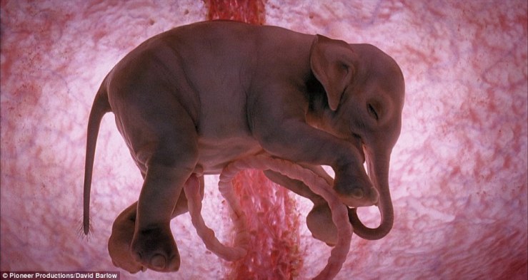 This Asian elephant foetus after 12 months in the womb is catching some shut eye before she takes her first heavy steps in the world in just under a year’s time. The gestation period for an elephant is 22 months. This and other animals in the womb were captured on camera by scientists for a National Geographic documentary. I think it’s really neat to see how similarly all mammals start, and an elephant that is ‘floating’ is simply mesmerizing. Check out more photos and details here.